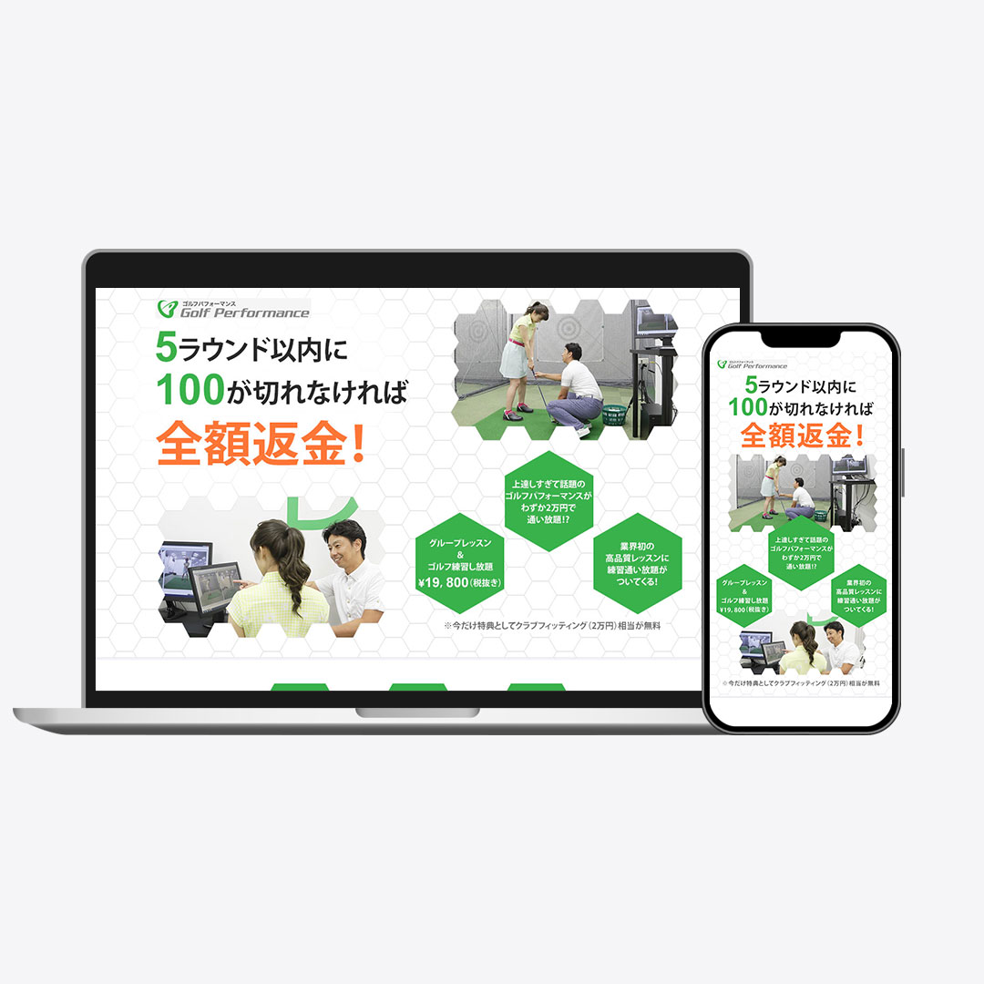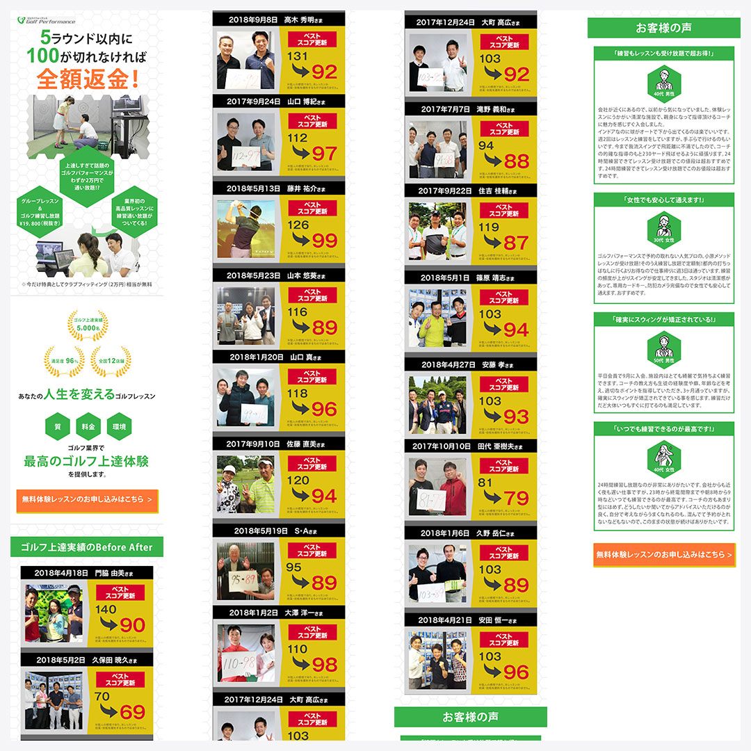 ゴルフLP(サンプル)制作 2025年11月21日 最終更新日時 : 2025年11月28日 yukinko ターゲット:50代から60代男性ゴルファー向け 目的:ゴルフ練習スタジオへの誘導 デザインの説明:世代として中高年にあたり老眼が始まる世代なので、文字を大きくし、色のコントラストをはっきりさせ、見やすくしました。 ゴルフボールの六角形を使用し遊び心を足しました。 Photoshop使用