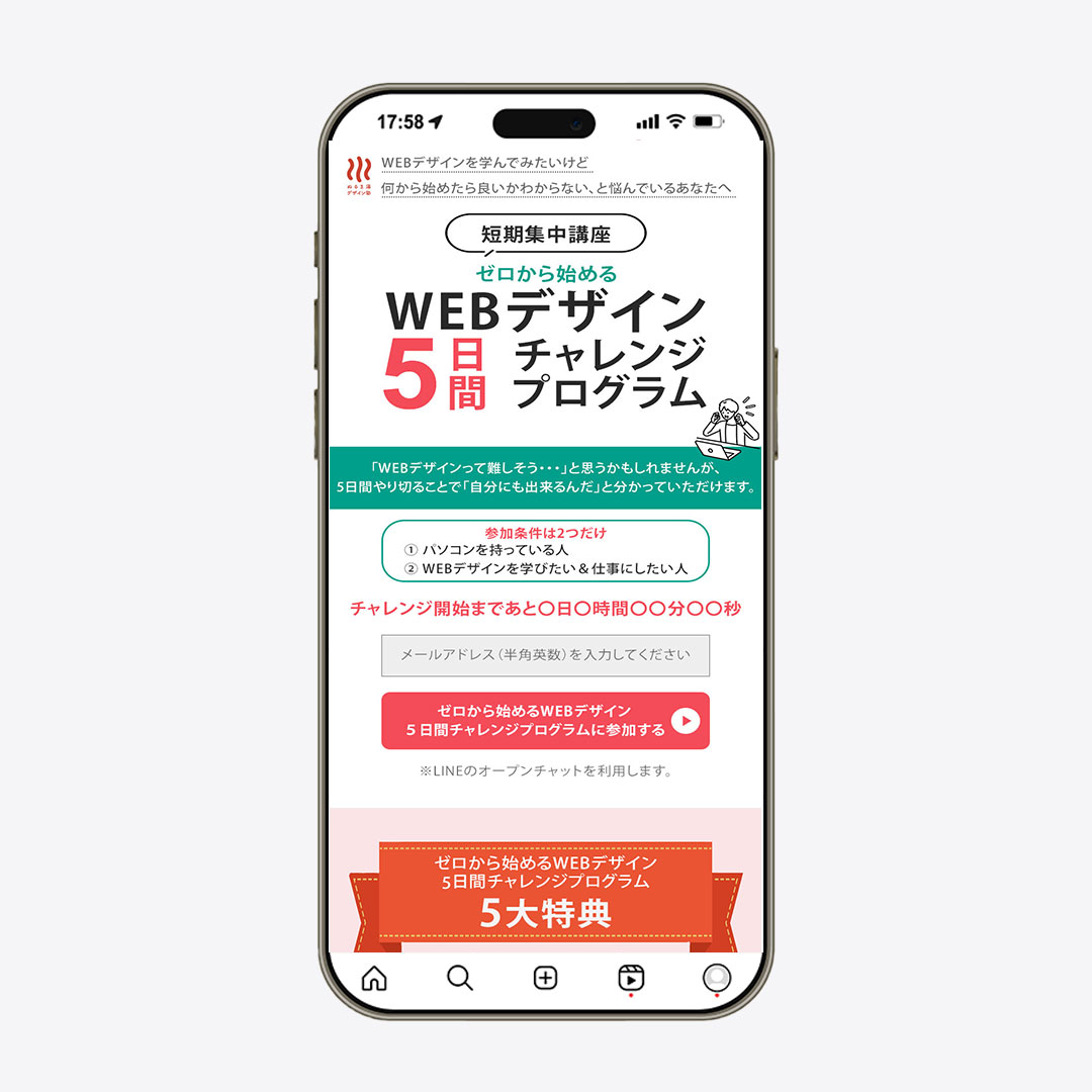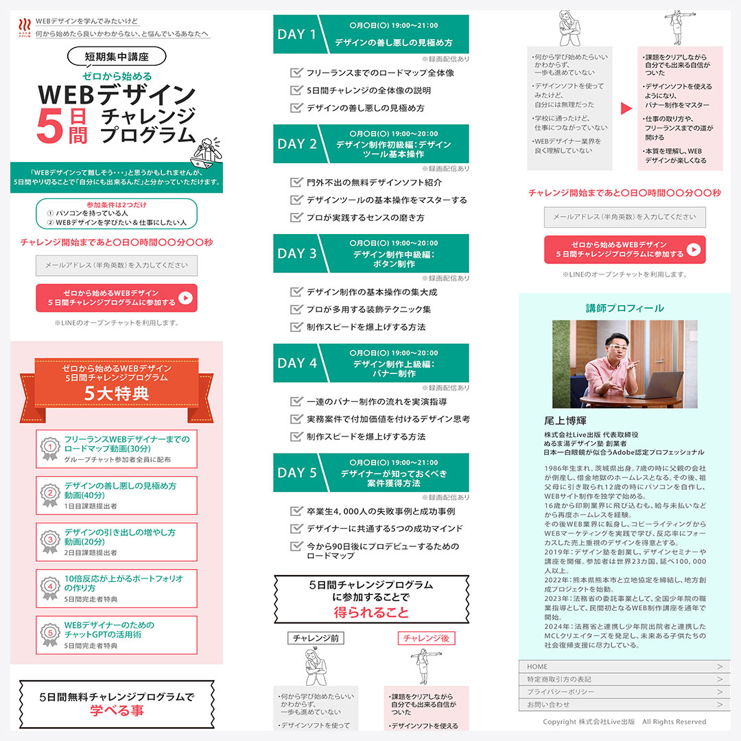 5日間チャレンジLP(サンプル)制作 2025年11月21日 最終更新日時 : 2025年11月28日 yukinko ターゲット:40代前後、男女、WEBデザインに興味がある人 目的:無料のWEBデザイン5日間チャレンジに参加してもらうこと デザインの説明:スマホ特化を意識して、文字のサイズやレイアウトを見やすく意識し、色は明るい印象にしました。 Photoshop使用